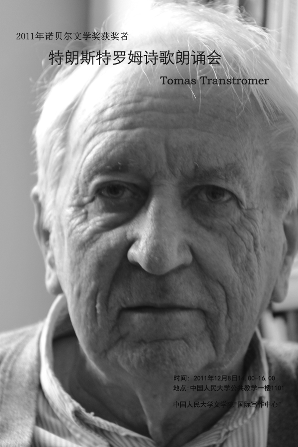 为庆祝瑞典诗人特朗斯特罗姆获得2011年诺贝尔文学奖,为满足广大学生和诗歌爱好者对特朗斯特罗姆诗歌的喜爱,亚洲a片 “国际写作中心”将在12月8日下午隆重举办特朗斯特罗姆诗歌专场朗诵会,瑞典驻华使节、在京的一些中国诗人和特朗斯特罗姆诗歌的中文译者李笠先生将参加朗诵会,朗诵会将以中文、瑞典文和英语等多种形式进行,欢迎广大高校学生和诗歌爱好者参加。