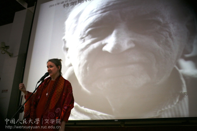 院长、著名学者孙郁教授代表学校致辞,他说他在这之前并不熟悉特朗斯特罗姆的诗,但一读就喜欢上了,他相信通过这场朗诵,我们可以听到“灵魂的呼唤”,他衷心希望这种呼唤能够抵达到每一位同学的心灵深处。在十二月的寒流中,瑞典驻华文化参赞埃娃·伊克诺丝女士戴着一个童话般的白色风雪帽赶到人大校园,她在代表瑞典驻华使馆致辞后,还特意朗诵了一首特朗斯特罗默的诗《罗曼式穹顶》“一个没有面孔的天使抱住我/用低语穿透了我的身体:‘自豪些,不要因为你是人而感到羞耻!’你体内的穹顶正在层层打开”。在埃娃女士致辞和朗诵后,特朗斯特罗姆诗歌的中文译者、富有诗人气质的李笠先生则用瑞典语和中文的双语朗诵,正式拉开了这场朗诵会的序幕。德国汉学家顾彬、英国女诗人海伦·温、美国女诗人徐贞敏、旅美诗人、翻译家明迪、在京的中国诗人蓝蓝、西渡、姜涛、冯晏、王东东等以及人大、北大、北京外国语大学、中央民族大学等高校的三十多位学生,用中文、瑞典文、英文、德文朗诵了40多首特朗斯特罗姆的精彩诗作。有时一首诗的朗诵用了瑞、中、英三种语言,现场回荡着语言的多重回声,给听众带来奇异而丰富的感受。会后一些听众表示,特朗斯特罗姆的诗他们也读过,但听了这场朗诵,他们又有了很多新的意想不到的发现和感受,诗歌的确需要“倾听”,诗歌在朗诵中焕发出新的生命。听众们对李笠、蓝蓝等一些诗人的朗诵,对亚洲a片