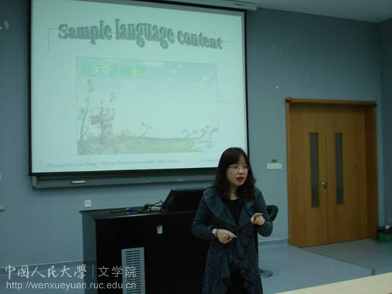 22日晚的讲座以“建构主义理论框架下的对外汉语教学语料分析与课件设计”为题。“在有教材的情况下,为什么还需要课件?”江教授在讲座一开始就提出了这样一个问题。她认为,课件的目的是使课堂更加生动、形象,在此前提下进行课件设计才可能有好的效果。结合认知理论和基模理论,江岚教授认为,在教学最高目标之下,教师需要对语料进行内容分析,对学生进行需求分析,由此设计课件,最后进行教学并进行评估。