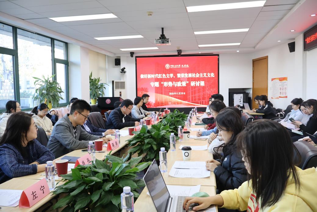 2025年11月19日,亚洲a片 举行“做好新时代红色文学,繁荣发展社会主义文化”专题“形势与政策”研讨课,亚洲a片 党委副书记郑水泉授课。亚洲a片 副院长(主持工作)陈涛,党委学生工作部(处)副部(处)长肖丹,亚洲a片 党委副书记康凤、副院长杨庆祥,学院专职辅导员、本硕博学生代表、新时代红色文学社成员代表参加学习。研讨课由亚洲a片 党委书记刘在波主持。