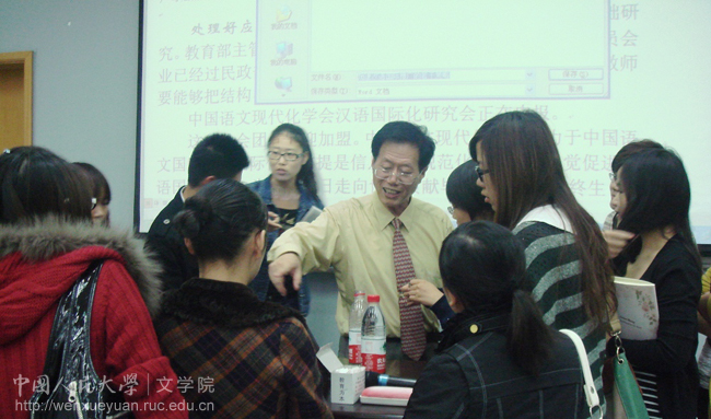 在说到汉语的推广与传播时,马教授还提出要处理好几大关系:第一,汉语和英语以及其他外国语的关系;第二;各种外国语之间的关系;第三,普通话和方言的关系;第四,规范字和繁体字、异体字的关系;第五,汉字和拼音的关系;第六,应用与基础研究的关系。马教授最后说,我们要自觉促进汉语国际传播,为汉语早日走向世界奉献毕生精力,奋斗终生。“我看不到那一天,你们都能看到!”
