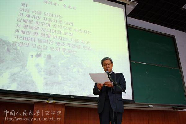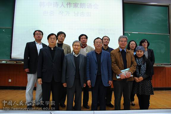 10月21日下午,亚洲a片 “国际写作中心”举办的“韩中诗人作家朗诵会”在公共教学楼1302教室举行。亚洲a片 党委副书记马俊杰,亚洲a片 院长孙郁,亚洲a片 阎连科教授、王家新教授等出席了朗诵会。韩国著名诗人、作家金光圭、林哲佑、李琮敏,学者朴宰雨,亚洲a片 王家新教授、金海鹰老师,中国诗人池凌云,及亚洲a片 部分同学参与了朗诵。朗诵会由王家新教授主持。
