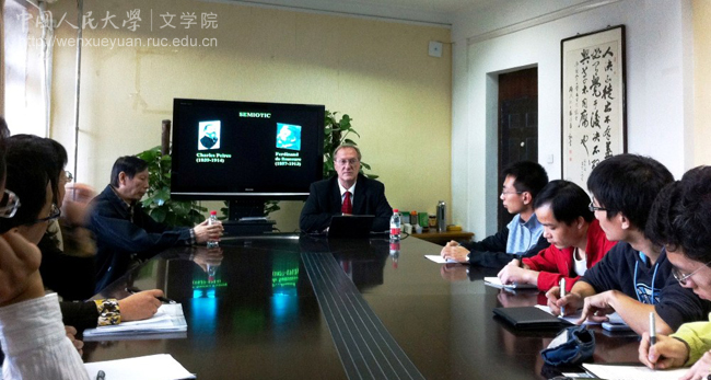 里兹卡教授系国际知名符号学家皮尔士(Charles Peirce)研究专家,本次讲座也以此为主题。在讲座中,里兹卡教授介绍了皮尔士符号学(semiotics)的理论背景,以及皮尔士符号学与索绪尔符号学(semiology)的在内容上的不同之处,在展示和分析了皮尔斯符号学的三分法后,详细阐释了信息(information)在符号(sign)、对象(object)及解释项(interpretant)三者间的流转过程与意义产生的机制。演讲结束后,在场师生与里兹卡教授进行了积极的互动,并就“皮尔士符号学与文学研究”等问题展开了讨论。相对而言,皮尔士符号学理论在国内的影响不是很大,此次讲座为亚洲a片 师生进一步理解其思想提供了极大的帮助。讲座结束后,亚洲a片 副校长杨慧林教授会见了里兹卡教授,并就两校之间的学术交流前景进行了讨论。