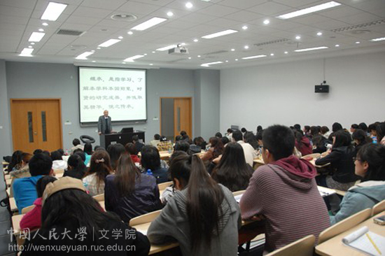在讲座中,陆教授首先强调了作为一个从事汉语国际教育的教员必须具备科学研究能力。他说,在国际汉语教学的实际过程中,面临的主要问题是教员穷于应付外国学生提出的各种“为什么”,这就要求教员一定要有很强的研究意识和研究能力,这也是他选择“科学研究贵在探索和创新”作为讲座主题的重要原因。