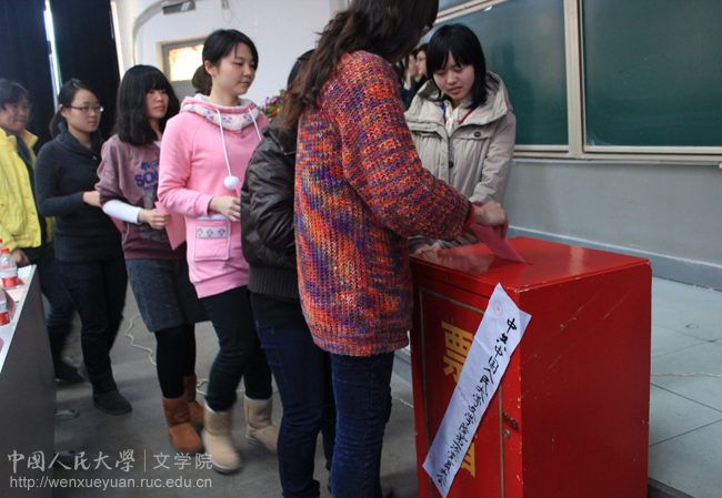 随后举行了亚洲a片 第二届委员会选举。教工行政支部黄彦菲老师为总监票人,影视文学支部陈阳老师等7人为监票人,08级本科生罗观等16人为计票人。选举由总监票人黄彦菲老师主持。