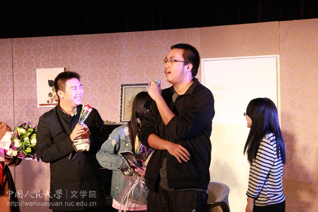 最后,全体演职人员在观众潮水般的掌声中依次谢幕,圆满结束了该剧在学生活动中心红星剧场的演出。商学院2013级的导演周易在发言中表示,《玩偶之家》作为妇女解放运动的宣言书,在过去曾经被推到时代的风口浪尖,引领了时代的改革大潮。而在母亲节上演《玩偶之家》具有特殊的意义,他希望能够启示到包括母亲们在内的女性在当下的社会中,重新思考女权的意义与价值。