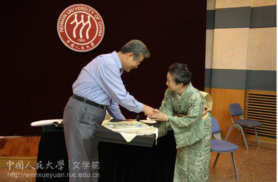 表演开始前,孙郁院长进行了简短的致辞,对表演团的到来表示了热烈的欢迎。随后,日本东京大学汉学教授、北京大学客座教授、日中传统艺术交流会会长刈间文俊先生介绍了日本香道的产生与历史发展。表演在热烈的掌声中开始。东京大学香道表演团的学生们身着和服,展示了传统的制香工艺,以及闻香、识香的具体方法,并通过“闻香、识香”的互动游戏,让每一位到场观众切身感受香道文化。表演结束后,表演团成员和亚洲a片 师生进行了热烈的交流。最后,高桥香愁女士向孙郁院长赠送了精美的画轴。整个交流表演会大约持续了2个小时,亚洲a片 部分教师和学生也参加了此次活动。